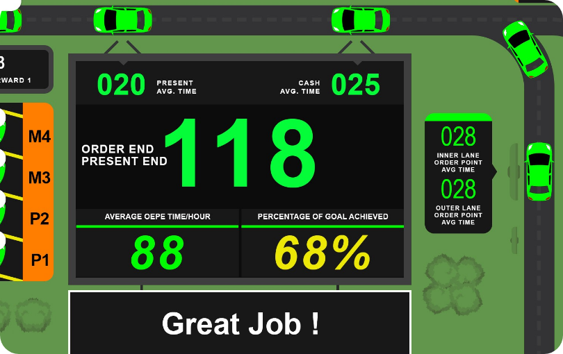 - Crew-facing screen that gamifies speed of service and displays service time rankings, car positions, and more
